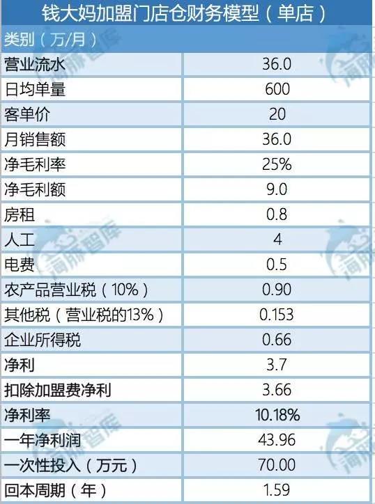 錢大媽加盟店單店財務模型 數據來源:公開信息整理