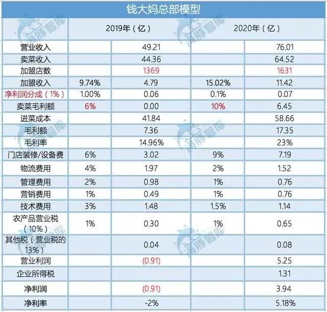 而錢大媽加盟門店總部的盈利模式主要是三大塊,加盟費,品牌使用費(即加盟店凈利潤的1%),還有總部為加盟店供菜而賺取的傭金。其中開店的一次性費用為70萬,7萬加盟費,其余63萬為裝修和設備費,按照業內標準,我們按照業內最低標準,假設毛利為30%。