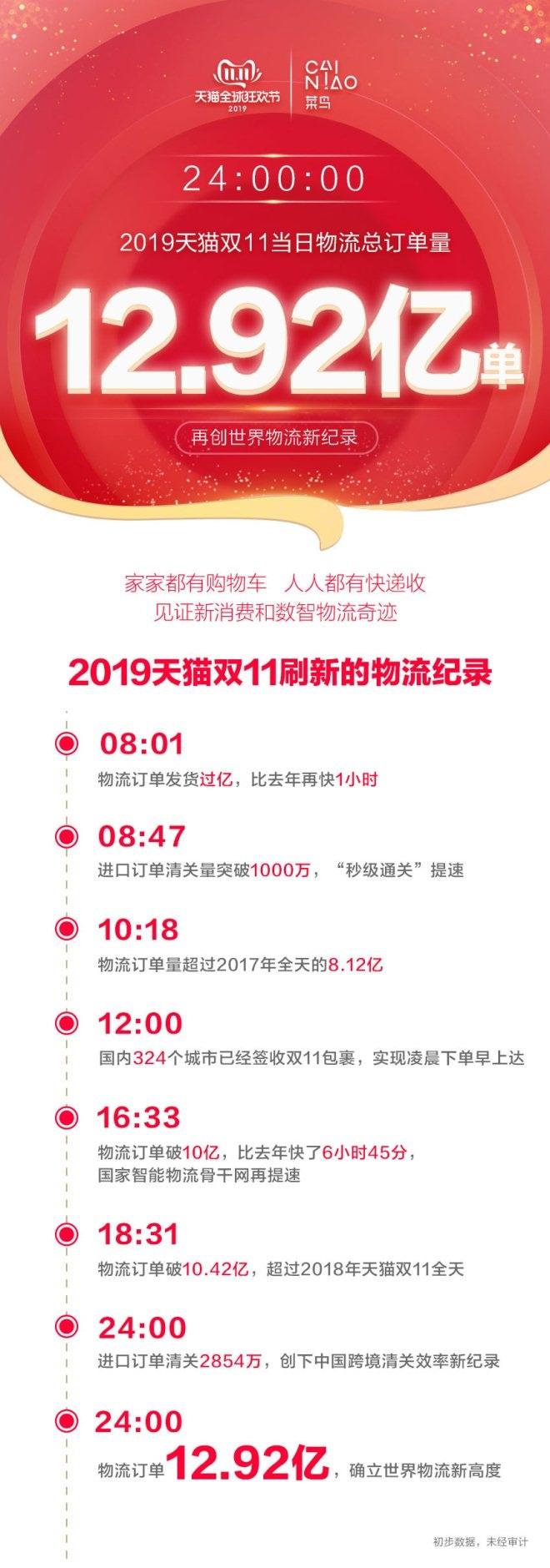 18小時31分,物流訂單破10.42億,超過2018年天貓雙11全天;