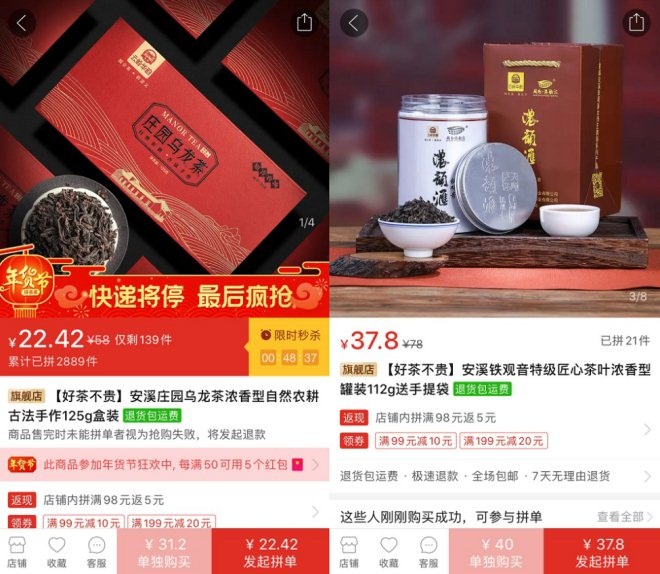 ▲云嶺茶葉帶來的莊園烏龍茶和大師鐵觀音,在拼多多年貨節(jié)期間,兩款產(chǎn)品還在原有價(jià)格基礎(chǔ)上推出了限時(shí)優(yōu)惠。