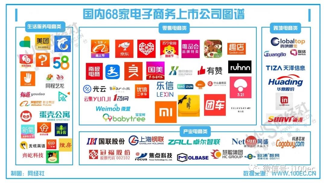 零售電商:阿里巴巴、拼多多、京東、小米集團、唯品會蘇寧易購、南極電商、達達、三只松鼠、良品鋪子、國美零售、壹網壹創、光云科技、中國有贊、微盟集團、小熊電器、寶尊電商、樂信、什么值得買、御家匯、歌力思、云集、1藥網、趣店、優信、寶寶樹集團、如涵控股、蘑菇街、寺庫、團車。