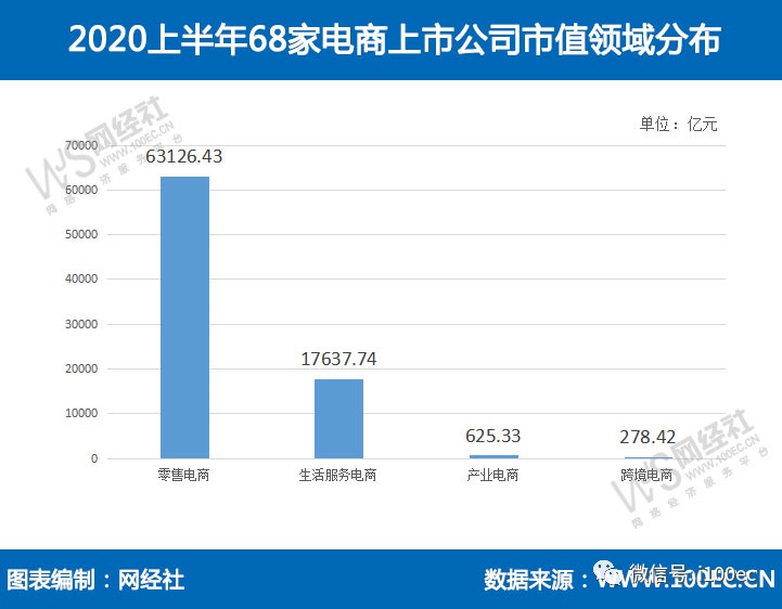 在市值分布上,據網經社“電數寶”數據庫顯示,2020上半年國內68家電商上市公司總市值81667.92 億元。其中,零售電商上市公司總市值63126.43 億元,占比77.29%;生活服務電商上市公司總市值17637.74 億元,占比21.59%;跨境電商上市公司總市值278.42,占比0.34%;產業電商上市公司總市值達625.33 億元,占比0.78%。