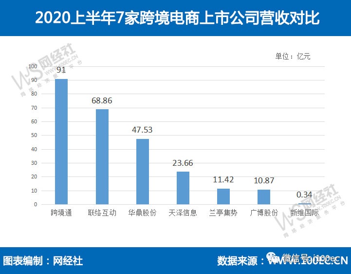 排名分別為:跨境通營收91億元,比上年同期增加1.31%;聯絡互動營收68.86億元,同比下降6.08%;華鼎股份營收47.53億元,同比增長29.05%;天澤信息營收23.66億元,同比增長110.31%;蘭亭集勢營收11.42億元,同比增長51.7%;廣博股份營收10.87億元,同比增長23.11%;新維國際營收0.34億元,同比下降61.53%。
