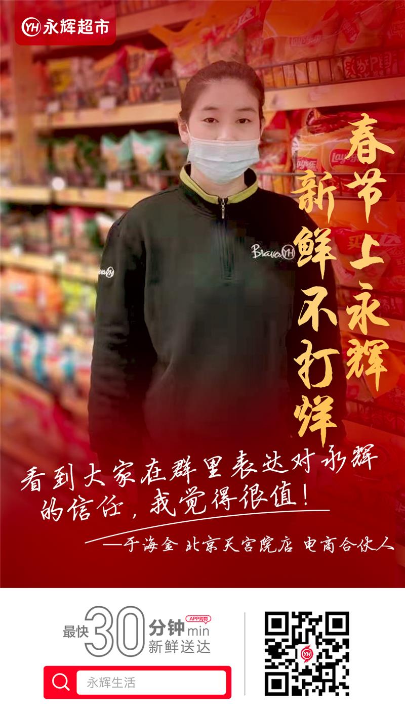 電商合伙人 于海金:北京大興區天宮院區域封閉管理以來,周邊小區居民的生活物資告急。我們天宮院店全體堅守一線,協調十個門店,對應十八個封閉小區的物資供應,完成訂單配送三萬多單,為隔離家庭送去物資、送去溫暖。