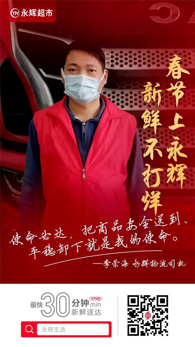 物流司機 李榮海:我干這行五六年了,一直給永輝送貨,風雨無阻。從閩侯的物流園發車,近的到莆田,遠的到寧化,平均每天有9到10個小時在路上,一個月下來能跑12000多公里。沒覺得苦不苦,使命必達,有活兒就得干。