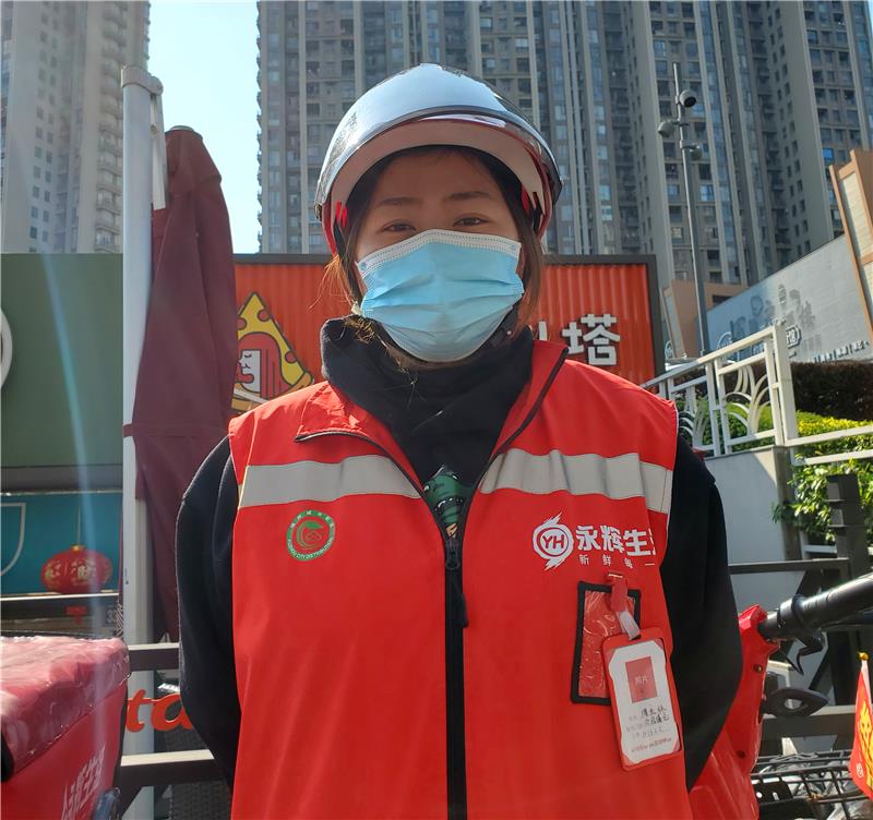 就職于永輝福州市公園道倉的周亞妹,是位并不多見的女性配送員。這個春節,她同樣選擇了留守。從早上6點到晚上8點,連續工作的七天,她也只在除夕當晚提前了半小時下班。