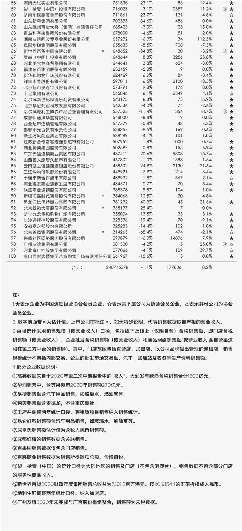 中國連鎖經(jīng)營協(xié)會發(fā)布顯示,雖然自1997年協(xié)會有統(tǒng)計以來百強整體銷售首次出現(xiàn)負增長,但從企業(yè)2020年新開門店情況看,連鎖百強逆勢布局的信心依然不減,2/3的企業(yè)門店總數(shù)比上一年有所增加,百強企業(yè)的門店總數(shù)比上一年增長8.2%。