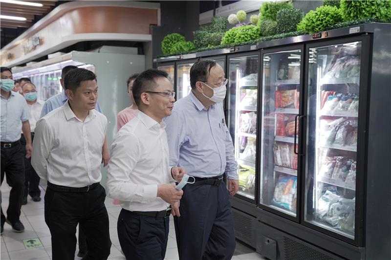 調研中,王炳南副部長深入了解了永輝超市內蔬菜、糧油、肉蛋等民生商品貨源、價格、及銷售情況,并對永輝超市為滿足居民日常生活基本消費和品質消費需求,豐富社區商業業態所做的努力和貢獻表示肯定,并組織全國各省市商務主管部門廳局代表到現場考察。
